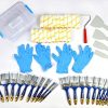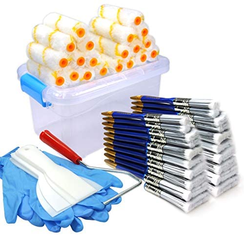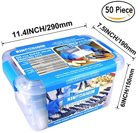 50 piece paint kit, include 20 piece premium paint brush sets, include 1/2 inchx4,1inchx4,1.5inchx4,2inchx4,2.5inchx4,100% polyester bristles,premium quality with beavertail flat polyester paint brushes,premium paint brushes designed to perform well with all paints,100% polyetser are no loss, ideal for all paints job,this specialized paint applicators are designed to all painting job easier with perfect maximum performance,Great Value sets for all painters,20 piece 4 inch mini paint roller covers with 4 inch paint roller frame make home repair works easy,4 piece plastic putty knife include 1.2 inch 2 inch 3 inch 4 inch ,4 piece gloves help painter protect hand without paints as they painting,all designed items detail care painters job, this is great value for paint job and painters gifts 1 piece pp box storage , this pp plastic storage with premium quality food class plastic , storage box help painter keep all paint sundries together
