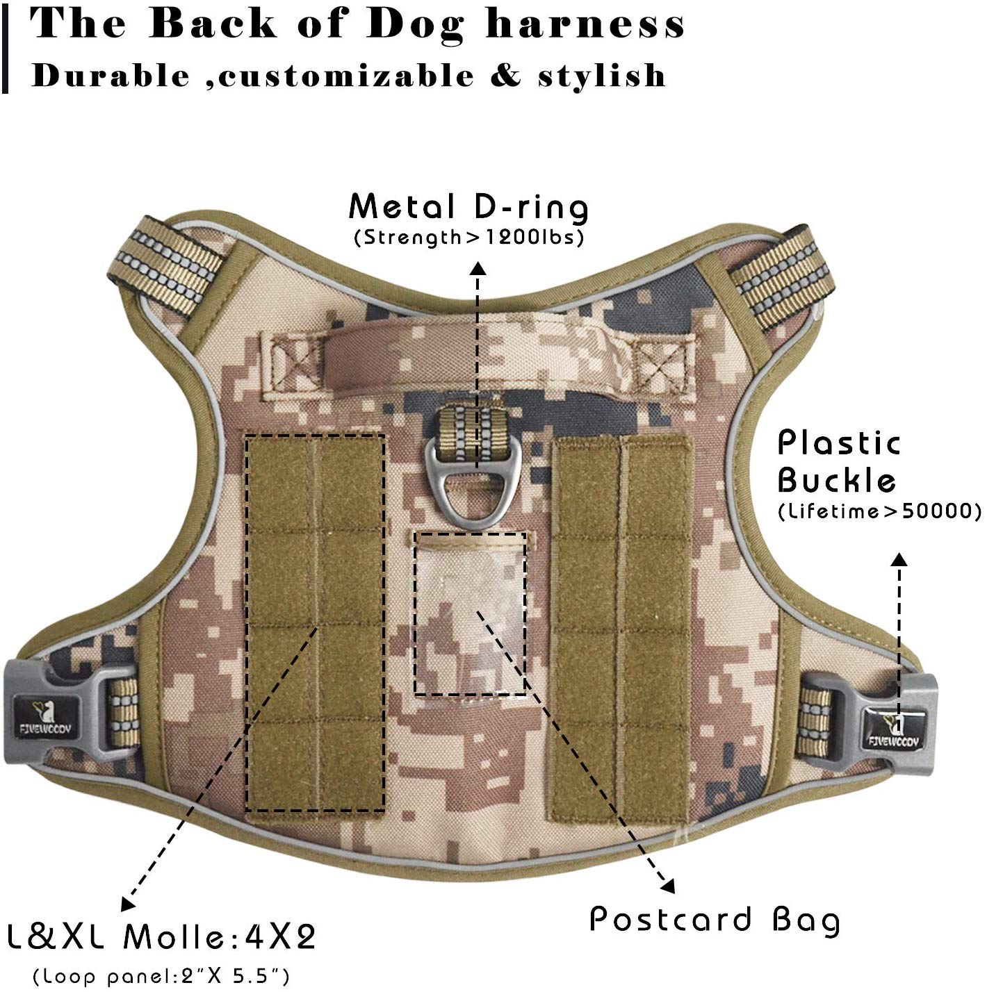 - MILITARY-STANDARD MATERIAL: Our heavy duty vest made of 900D Nylon with sturdy stitching for extra durability, suitable for all fields use. Two rings can bear great pulling force , ensuring your dog is safe during training, hunting, working, and any other occasions. Well padded in every pressure load point to protect your dog’s skin, while the breathable air mesh keeps your dog comfortable.