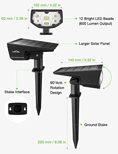 Cool White Light Solar Spotlights: Brighter 12 LEDs with Wider 120°Lighting Angle & 90°Adjustable Bigger Solar Panel & Longer Working Time with 18650 lithium rechargeable battery. LITOM solar landscape light is much more unique, fashionable and practical compared to other 4-6 LED lights in the market.