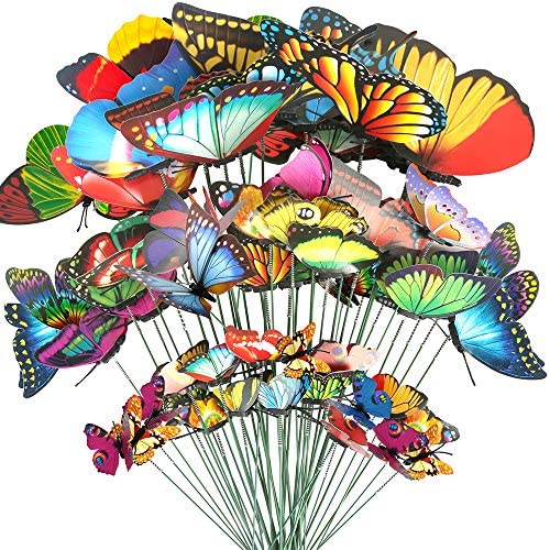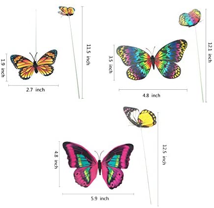 【5 DIFFERENT SIZES】: expanded width butterflies are 1.7inch/ 2.7 inch/ 3.5 inch/ 4.8 inch/ 5.9 inch wide, length of each stake is appox.10 inch; these great sizes can meet your various need for decor different surroundings
